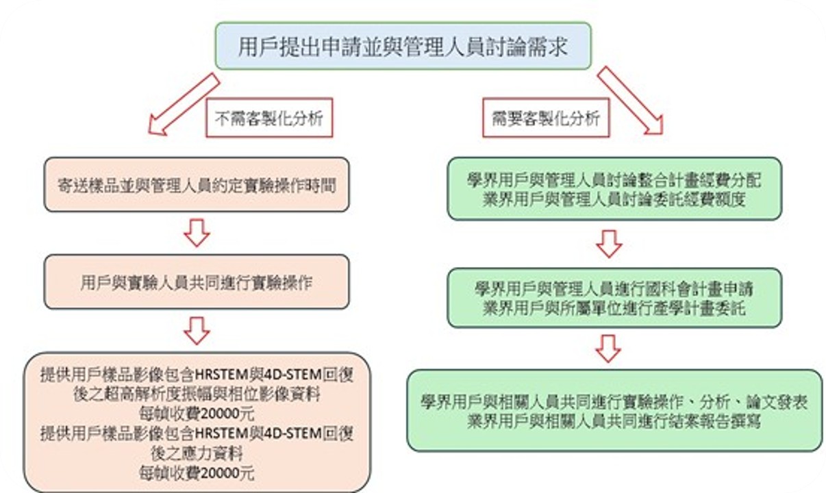 「四維掃描電鏡實驗室」的運作模式可分為兩種模式。用戶與管理人員進行實質討論後,分流採用非客製化服務或客製化服務。非客製化服務採用傳統以影像數量計費模式,而客製化服務則以合作申請與執行科研計畫方式進行。